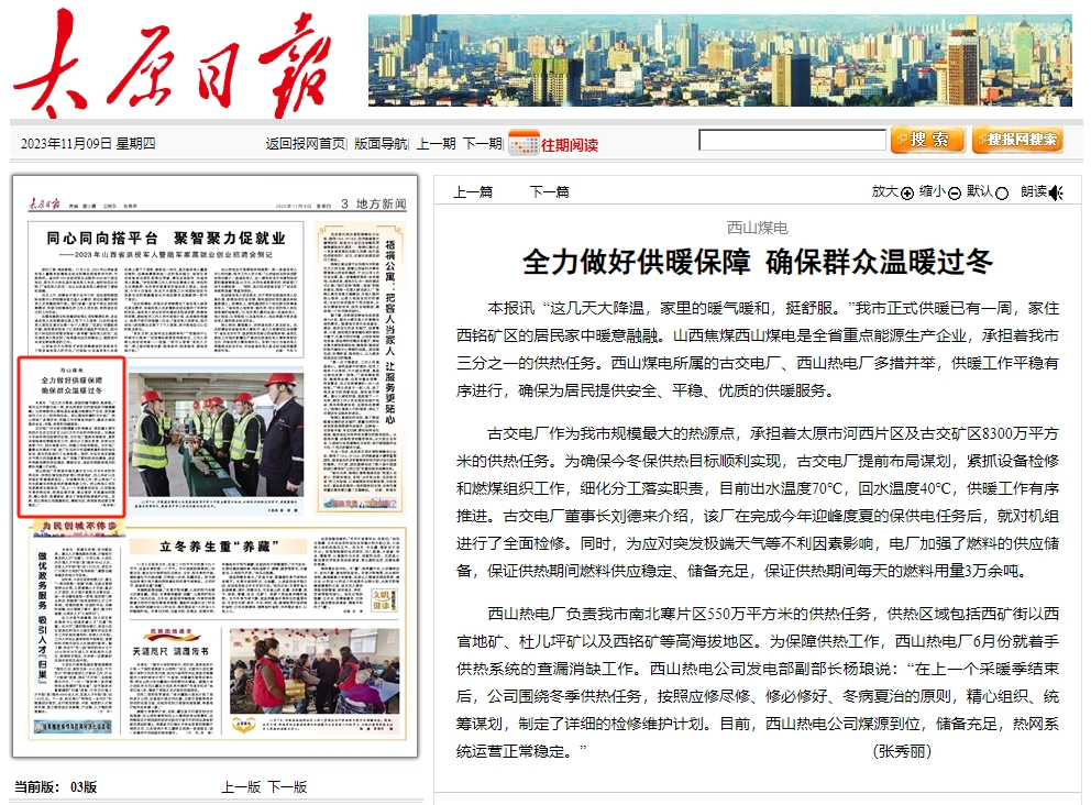 【太原日?qǐng)?bào)】西山煤電全力做好供暖保障 確保群眾溫暖過冬